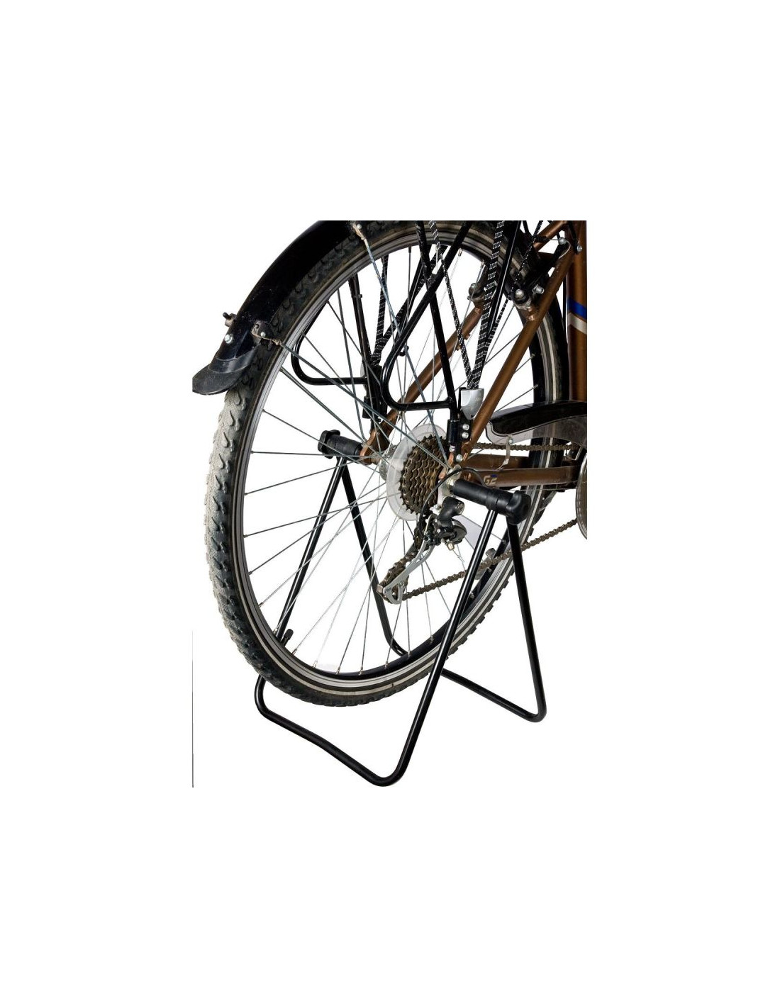 Konstrukcja stojaka jest wykonana z metalu i metalowych profili malowanych proszkowo i pasuje do rowerów z kołami 20-28 cali.