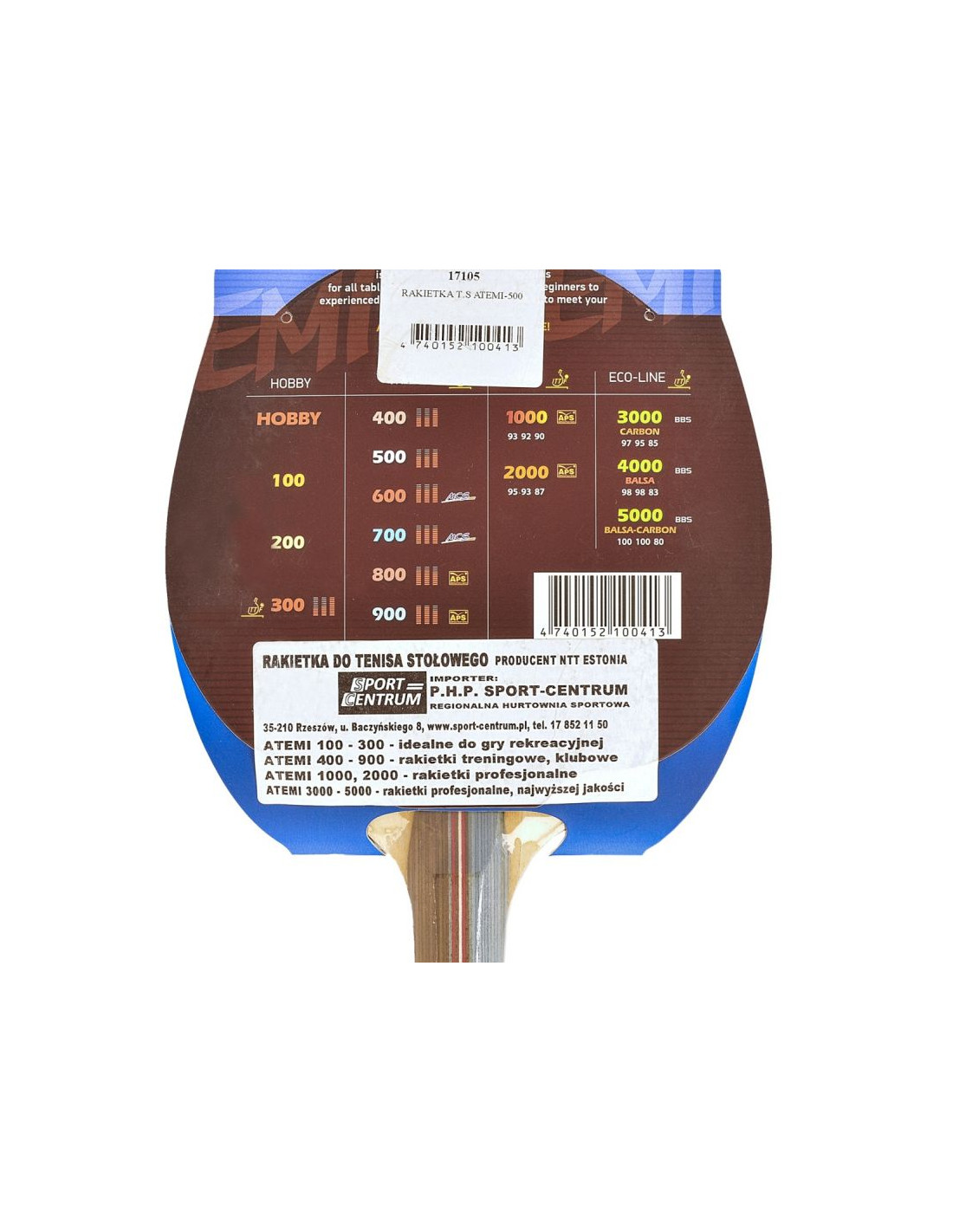 Rakietka do tenisa stołowego Atemi 5000 to produkt przeznaczony dla profesjonalistów, zapewniający rewelacyjną szybkość i kontrolę. Wykonany z najlepszych materiałów: 7-cio warstwowej sklejki z przekładkami karbonowymi i BALSA, gąbki o grubości 2,2 mm, okładzin ofensywnych ( Atemi IPPON ). W skali 1-10: Szybkość: 10 Rotacja: 10 Kontrola: 8 BBS (Best Balance System) System który zapewnia doskonałe czucie piłeczki. Pusta przestrzeń w rączce redukuje ciężar rakietki i przesuwa środek ciężkości dalej od rączki przez to możliwe jest szybsze przyśpieszenie bez straty czucia piłeczki.