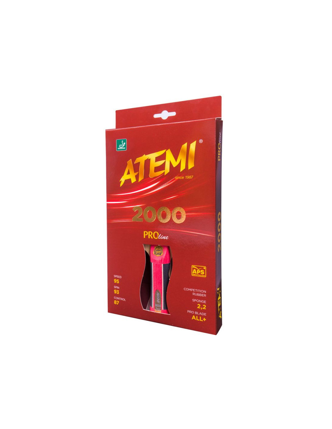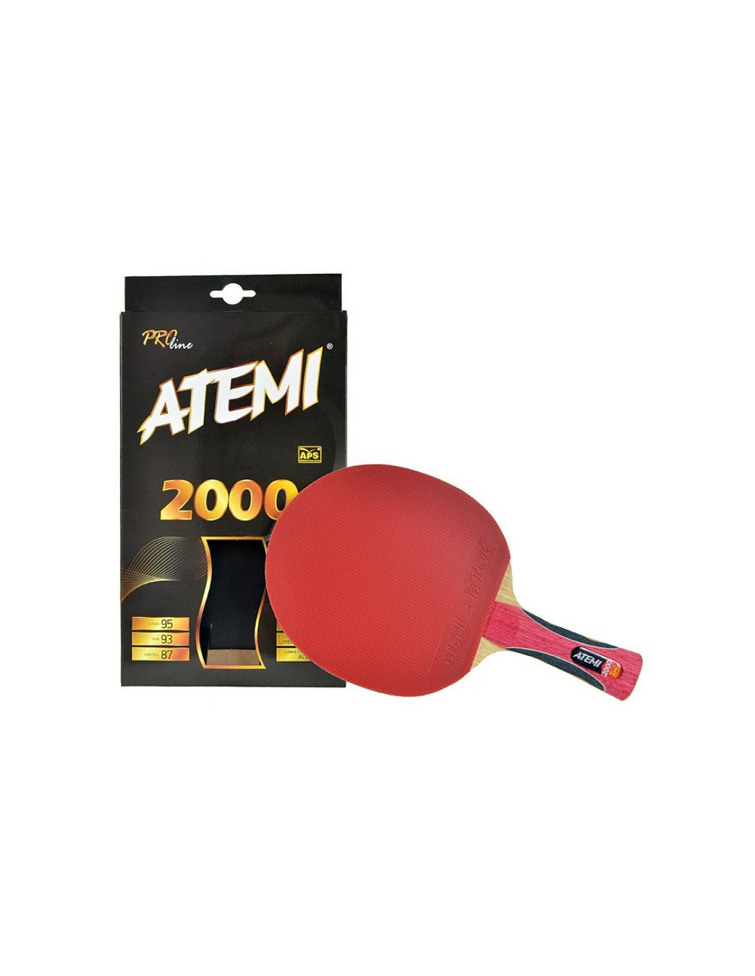 Rakietka Atemi 2000 z serii Pro line z uchwytem concave(wklęsły) przeznaczona jest na mecze rozgrywane na najwyższym poziomie. Polecana jest dla profesjonalistów. Posiada atest ITTF. Jest idealnym rozwiązaniem dla zawodowych graczy lubiących rotację oraz szybkość na niewiarygodnym wysokim poziomie przy zachowaniu doskonałej kontorli nad piłeczką. Rakietka Atemi 2000 Pro line poprawi Twoje wyniki w grze w tenisa stołowego. Wykonana została z 5 warstwowej sklejki (Limba, Acajou, Abachi), gąbki o grubości 2,2 mm i okładzin ofensywnych IPPON. Zastosowany w tej rakietce opatentowany system APS - Additional Power System to nowość w rakietkach do tenisa stołowego. Puste przestrzenie, które zostały umieszczone w rączce rakietki, zmniejszaj ciężar i przesuwają środek ciężkości rakietki z dala od rączki. Dzięki temu możliwe są bardzo szybkie przesunięcia bez utraty czucia piłeczki. Konstrukcja rączki wykazuje większą elastyczność po obu stronach poprzez uchwyty, które działają jak "sprężyny". Dzięki tej funkcji, gracz osiąga lepszą kontrolę piłeczki.