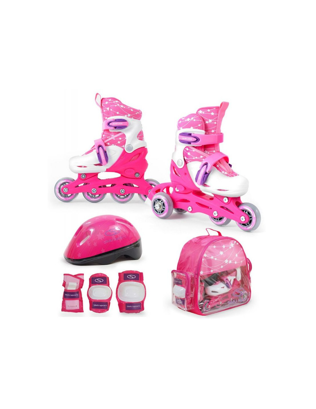 Zestaw SMJ Sport Combo Pink LED: 2w1 wrotko-rolki HS-TNK-000009549Właściwości:Zestaw COMBO marki SMJ sport model COMBO SET BS901P 2w1 PINK:  wrotko - rolki + kask + komplet ochraniaczy + praktyczna torbaŚwiecące kółka LED !Wrotko-rolki Wrotko-rolki p