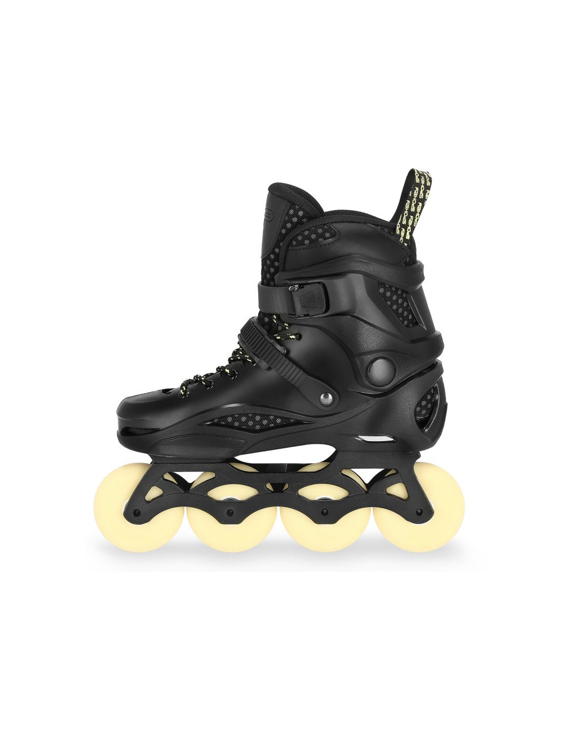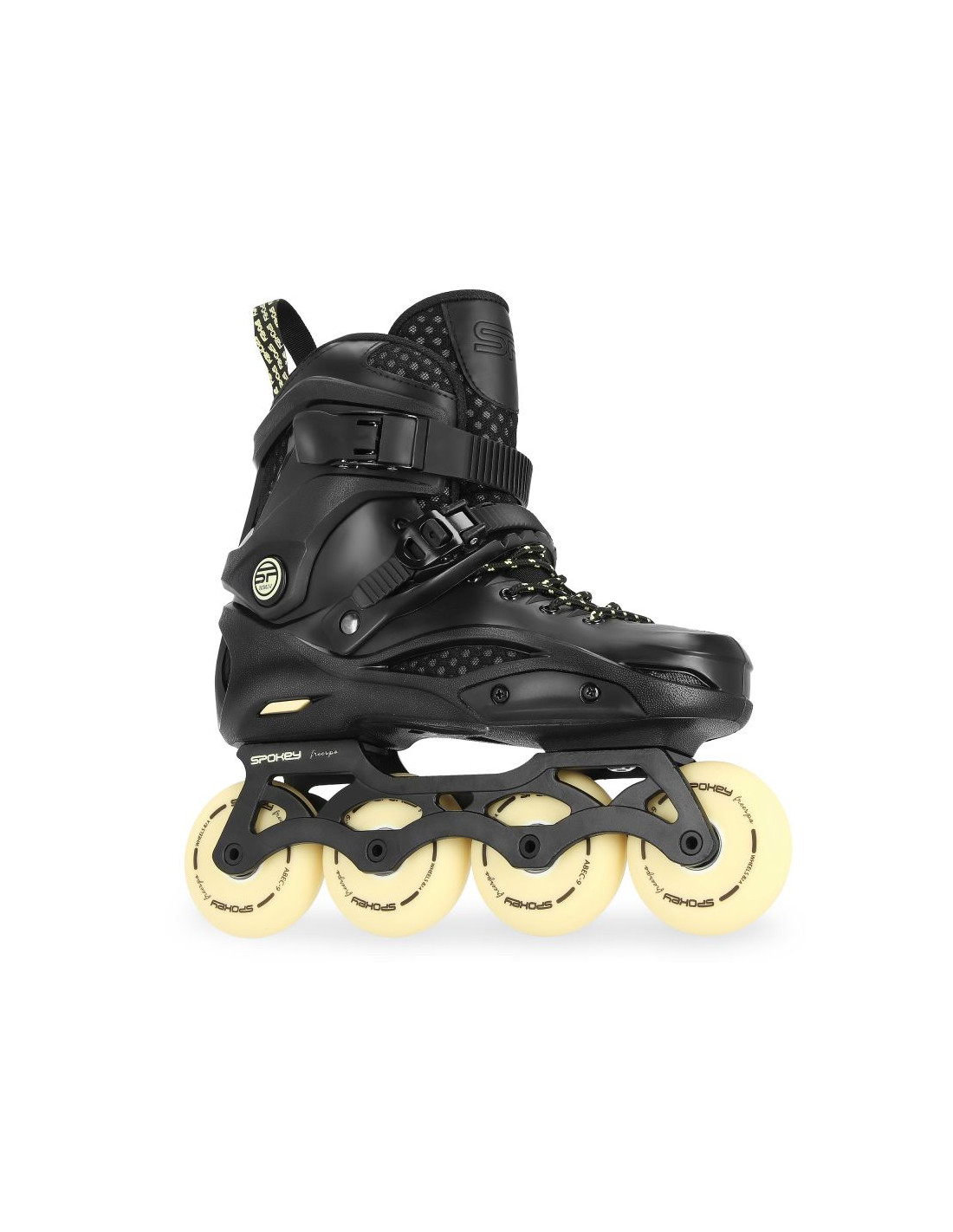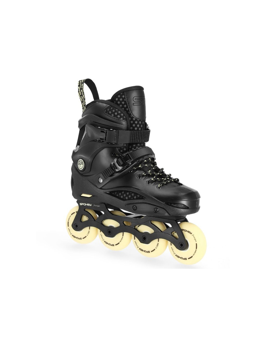Rolki Spokey FREESPO to połączenie komfortu jazdy oraz najlepszych parametrów technicznych. Zastosowanie twardej skorupy, wykonanej z PP* (wysoce elastyczny polipropylen), zapinanej na dwie klamry (górną klasyczną oraz dolną z pompką zaciskową) oraz sznurowadła, zapewnia optymalne dopasowanie buta do stopy. Zmniejsza to ryzyko doznania kontuzji i jednocześnie umożliwia perfekcyjne kontrolowanie manewrów i skrętów podczas jazdy. Konstrukcja Freespo niweluje także błędy, które często pojawiają się u początkujących skaterów, takie jak np. koślawienie kostek.