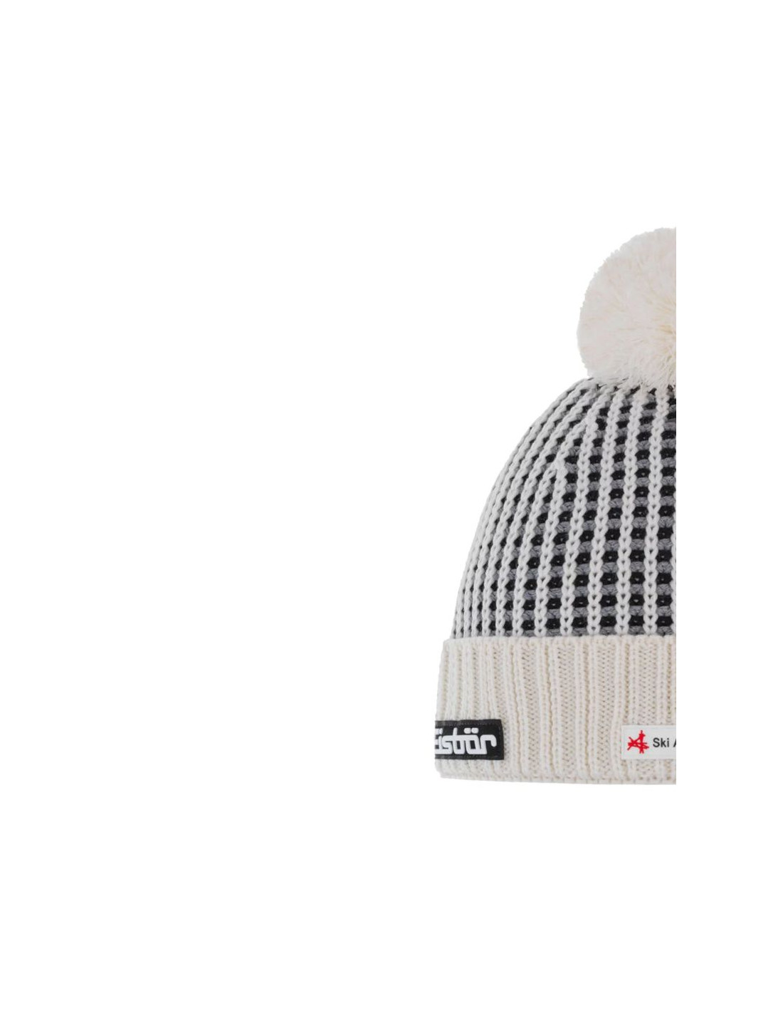 - Stylowy design: wzór ściągacza, kolorowe paski i puszysty pompon