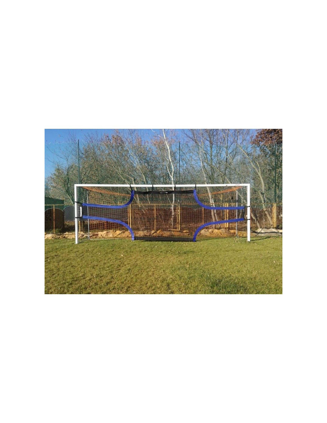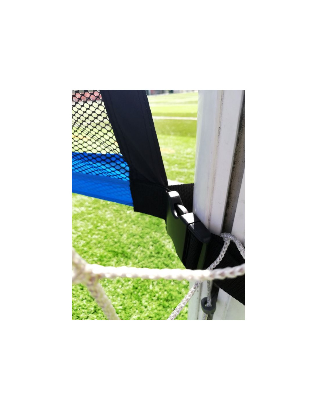 - Mata montowana jest do bramki za pomocą gumowych obejm z klipsami plastikowych klamr.