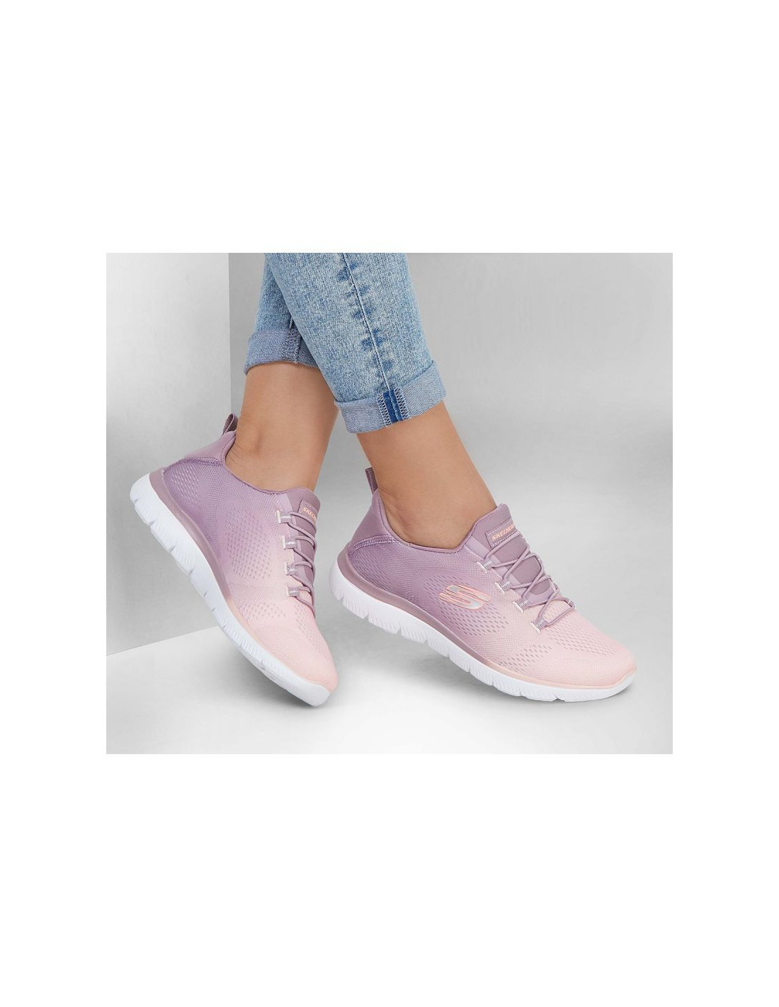 Z łatwością zapewnisz sobie kolorowy komfort dzięki Skechers Summits – Bright Charmer. Te wsuwane buty z wzorem ombré mają cholewkę z miękkiej siateczki, elastyczne sznurowadła i amortyzującą wkładkę Skechers Memory Foam™.