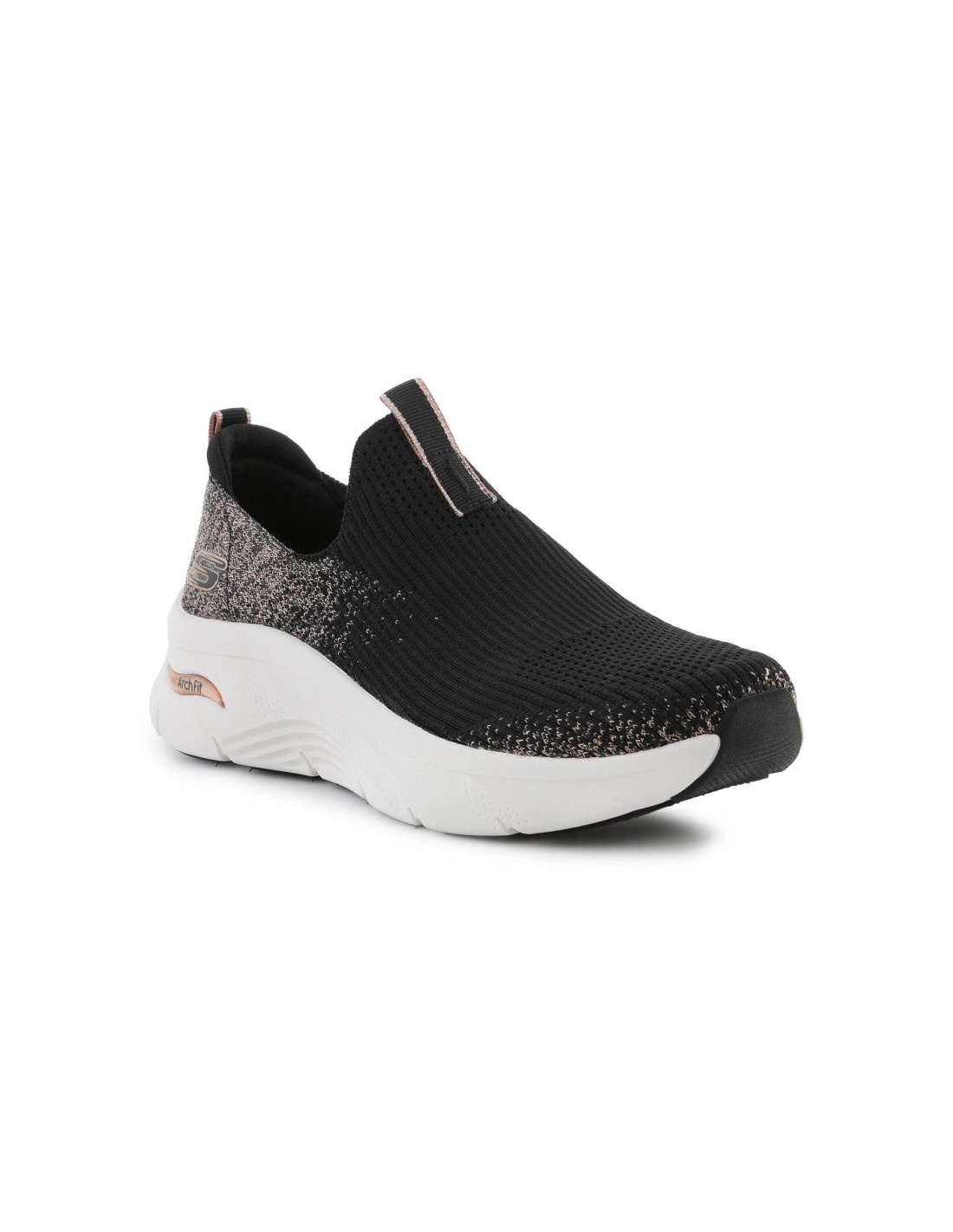 Skechers Arch Fit D'Lux – Glimmer Dust to idealne połączenie wygody i elegancji. Dzięki technologii Arch Fit zapewniającej wsparcie łuku stopy oraz amortyzowanej podeszwie środkowej, buty te doskonale sprawdzą się na co dzień i podczas dłuższych spacerów. Stylowe zestawienie czerni z różowym złotem oraz delikatne, połyskujące detale nadają im unikalnego charakteru. Idealne dla osób, które cenią wygodę bez rezygnacji z modnego wyglądu.