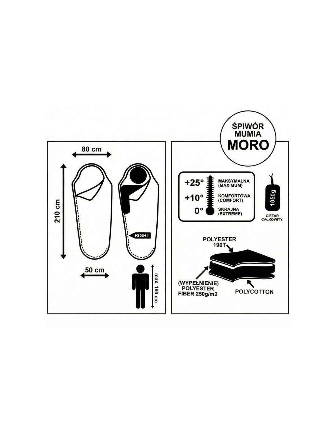 - Wymiary śpiwora ok.: 210 x 80 - 50 cm (dł. x szer.)