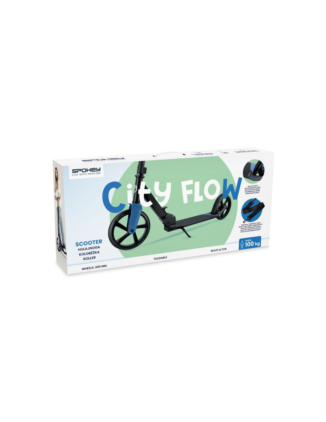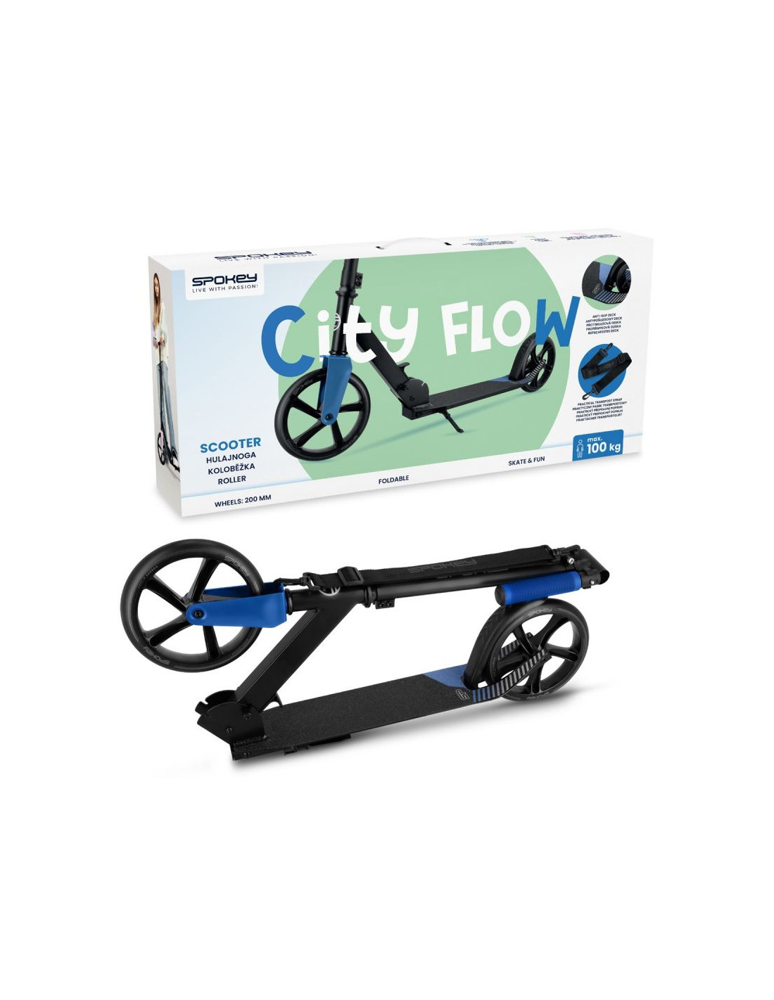 Hulajnoga City Flow to doskonały wybór dla osób, które szukają wygodnego i ekologicznego sposobu na poruszanie się po mieście. Wyposażona w duże kółka 200 mm o twardości 82A oraz wysokiej jakości łożyska ABEC-7 gwarantuje płynną jazdę nawet na nierównych nawierzchniach. Kluczowe cechy: Regulowana wysokość kierownicy: trzy poziomy (83 cm, 88 cm, 93 cm), dopasowane do różnych użytkowników. Duże kółka 200 mm: wykonane z trwałego poliuretanu (PU) o twardości 82A, zapewniają stabilność i komfort jazdy. Łożyska ABEC-7 Carbon: dla lepszej płynności i szybkości. Antypoślizgowy deck: gwarantujący komfort jazdy i większą kontrolę. Możliwość składania: ułatwia transport i przechowywanie. Praktyczny pasek transportowy: dla dodatkowej wygody. Lekka konstrukcja: wykonana z aluminium i stali, waży zaledwie 3,5 kg. Hulajnoga miejska City Flow z regulowaną wysokością kierownicy to perfekcyjna propozycja dla miłośników rekreacyjnej jazdy, niezależnie od poziomu zaawansowania. Wytrzymała konstrukcja łączy w sobie lekkość aluminium i solidność stali, dzięki czemu hulajnoga z powodzeniem wytrzymuje obciążenie do 100 kg. Duże, poliuretanowe kółka o twardości 82A współpracują z wysokiej klasy łożyskami ABEC-7 Carbon, co sprawia, że jazda jest niezwykle płynna, nawet na mniej idealnych nawierzchniach. Antypoślizgowy deck zapewnia stabilność podczas jazdy, a nożny hamulec gwarantuje skuteczność hamowania w każdym momencie. Dzięki możliwości składania oraz praktycznemu paskowi transportowemu, hulajnoga jest łatwa do przechowywania i przenoszenia, co czyni ją idealną do codziennego użytku w miejskich warunkach. Korzyści dla użytkownika - dlaczego warto wybrać hulajnogę City Flow? Wszechstronność: regulowana wysokość kierownicy pozwala na dostosowanie do potrzeb różnych użytkowników. Mobilność: lekka konstrukcja, możliwość składania i pasek transportowy ułatwiają przemieszczanie się i przechowywanie. Wytrzymałość: wysokiej jakości materiały oraz solidna budowa zapewniają długotrwałe użytkowanie. Dane techniczne: Materiał: 50% aluminium, 50% stal Łożyska: ABEC-7 Carbon Kółka: 200 mm, PU, 82A Wymiary: 93 x 90 x 35 cm Wymiary po złożeniu: 74 x 11 x 35 cm Regulowana wysokość: 83-88-93 cm Hamulec: nożny Stopka: tak Waga: 3,5 kg Maksymalna waga użytkownika: 100 kg Norma: EN 14619 Polecany do: jazda rekreacyjna Poziom zaawansowania: początkujący, średniozaawansowany Uwagi dotyczące bezpieczeństwa: Należy stosować środki ochrony indywidualnej. Nie nadaje się dla dzieci o masie ciała większej niż 100 kg Do stosowania pod nadzorem osoby dorosłej. Nie używać w ruchu ulicznym. Instrukcja użytkowania