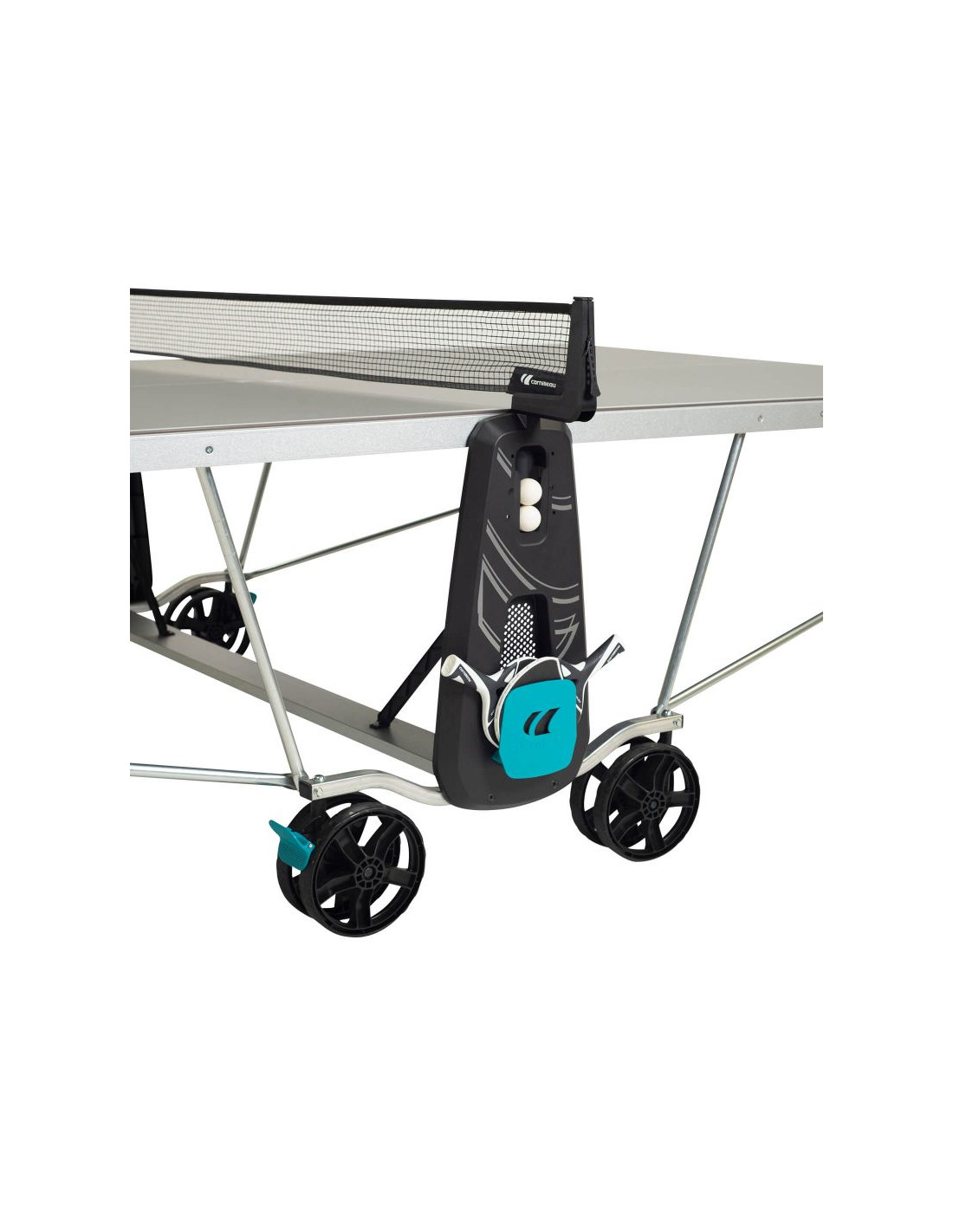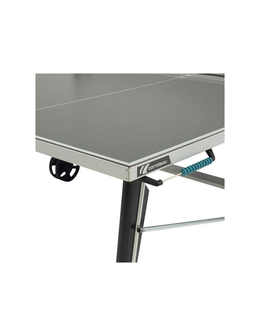 DUŻE KOŁA Z HAMULCAMI: Stoły ping pongowe Cornilleau posiadają duże podwójne koła o grubości 32 mm i średnicy 200 mm. Takie rozwiązanie zwiększa toczenie kół oraz stabilność stołu. Większe koło z łatwością wtoczy się przez duże przeszkody takie jak schody, progi kamienie. Łatwiej pokonuje gęstą trawę i inne nierówności, z kolei dwa hamulce zapewniają doskonałą stabilność i bezpieczeństwo podczas gry. Jest to także szczególnie przydatne gdy stół jest przechowywany na lekko nierównej powierzchni.