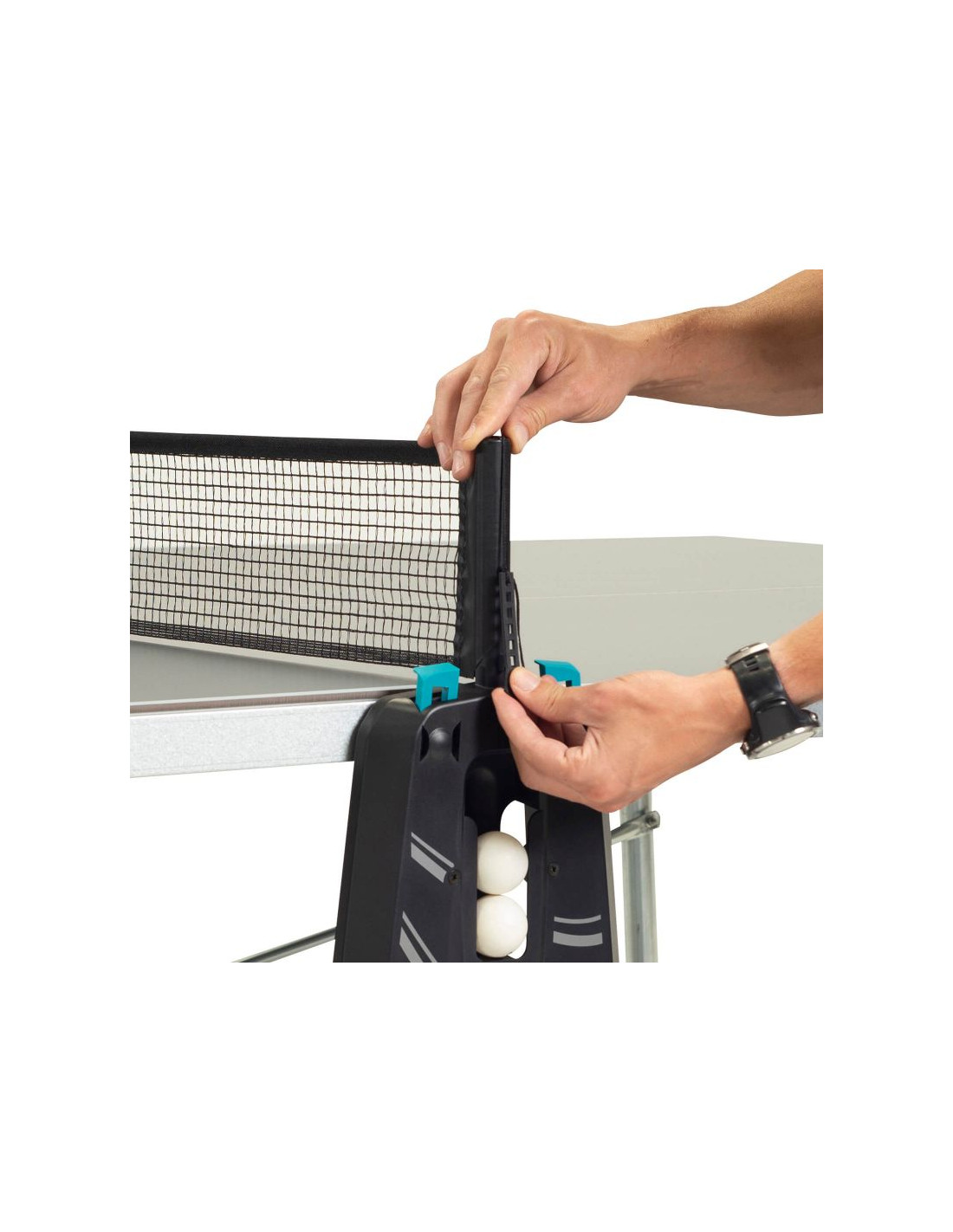 COMPACT TECHNOLOGY®: Opatentowany system zapewnia maksimum bezpieczeństwa i łatwość składania stołu. Złożony stół nie zajmuje dużo miejsca i jest stabilny podczas przechowywania oraz transportowania. Ta technologia pozwala nam także na grę w pojedynkę przez złożenie tylko jednego z blatów.