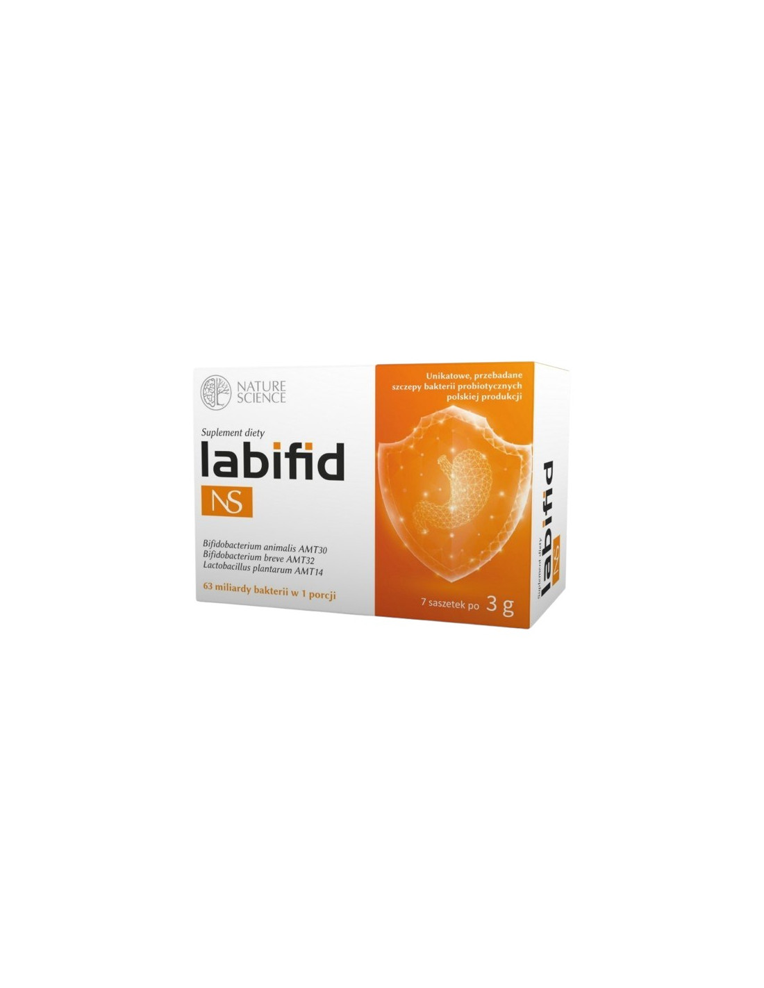 Skrobia kukurydziana (substancja wypełniająca/nośnik), maltodekstryna (substancja wypełniająca/nośnik), bakterie kwasu mlekowego: Bifidobacterium animalis AMT30 min. 1x10^10 jtk/g jednostek tworzących kolonie, Bifidobacterium breve AMT32min. 1x10^10 jtk/g jednostek tworzących kolonie, Lactobacillus plantarum AMT4 min. 1x10^9 jtk/g jednostek tworzących kolonie.