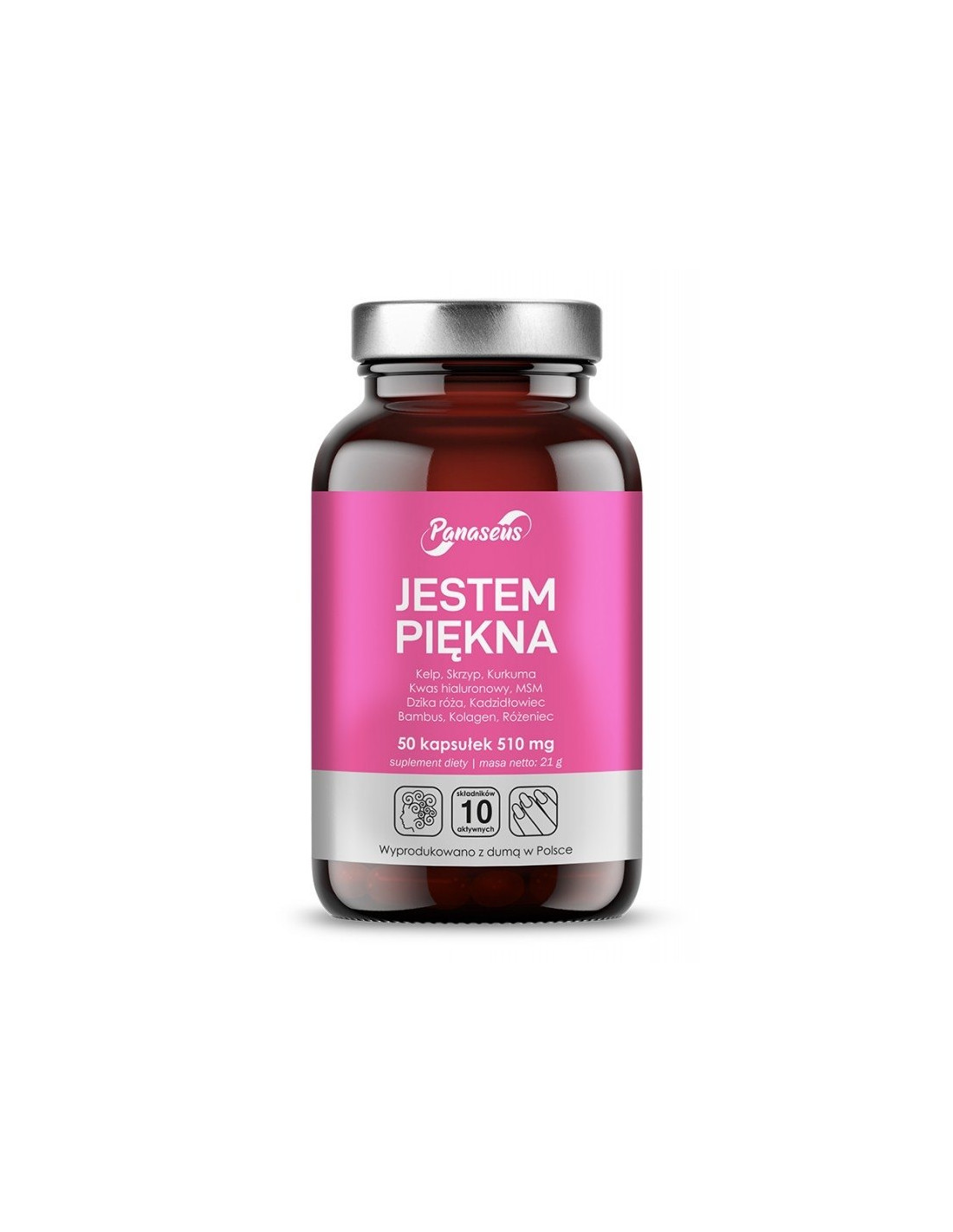 Ekstrakt z liści bambusa (Bambusa vulgaris) standaryzowany na zawartość min. 70% krzemionki, ekstrakt z dzikiej rózy (Rosa canina) standaryzowana na zawartość min. 70% witaminy C, metylosulfonylometan, ekstrakt ze skrzypu polnego (Equisetum arvense) standaryzowany na zawartość min. 7% krzemionki, substancja wypełniająca: inulina (prebiotyk), ekstrakt z kurkumy (Curcuma longa) 10:1, ekstrakt z morszczynu pęcherzykowatego (Fucus vesiculosus) standaryzowany na zawartość 0,43% jodu, ekstrakt z korzenia różeńca górskiego (Rhodiola rosea) standaryzowany na zawartość min. 3% salidrozydów, niskocząsteczkowy hialuronian sodu (kwas hialuronowy), kolagen rybi typu I i III, ekstrakt z żywicy kadzidłowca indyjskiego (Boswellia serrata) standaryzowany na zawartość min. 65% kwasów boswelliowych. Skład kapsułki: celuloza roślinna (wegetariańskie).