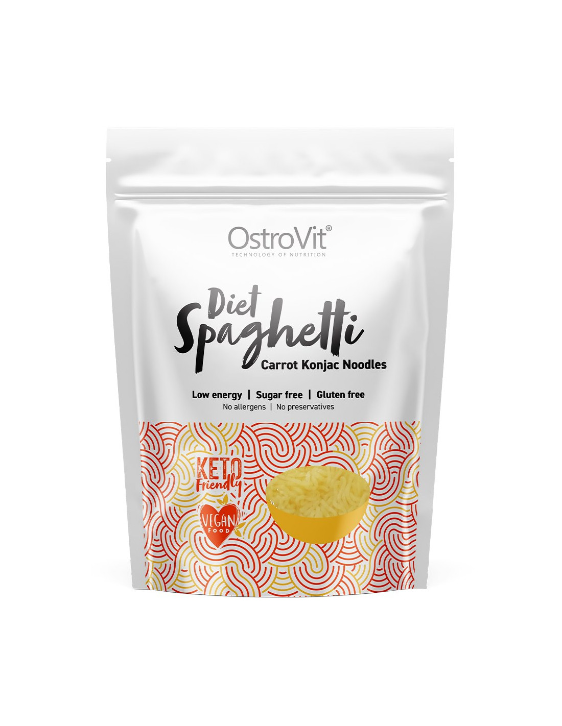 OstroVit Diet Spaghetti Carrot Konjac Noodles to niskokaloryczny odpowiednik klasycznego makaronu spaghetti. Produkt został wyprodukowany z mąki konjac oraz sproszkowanej marchewki. Makaron jest w pełni bezglutenowy, a w składzie nie zawiera dodatku cukru. Charakteryzuje się niskim indeksem glikemicznym, a także niewielką zawartością tłuszczu. Poszukujesz smacznej alternatywy dla klasycznego pszennego makaronu? Koniecznie przetestuj OstroVit Diet Spaghetti Carrot Konjac Noodles!