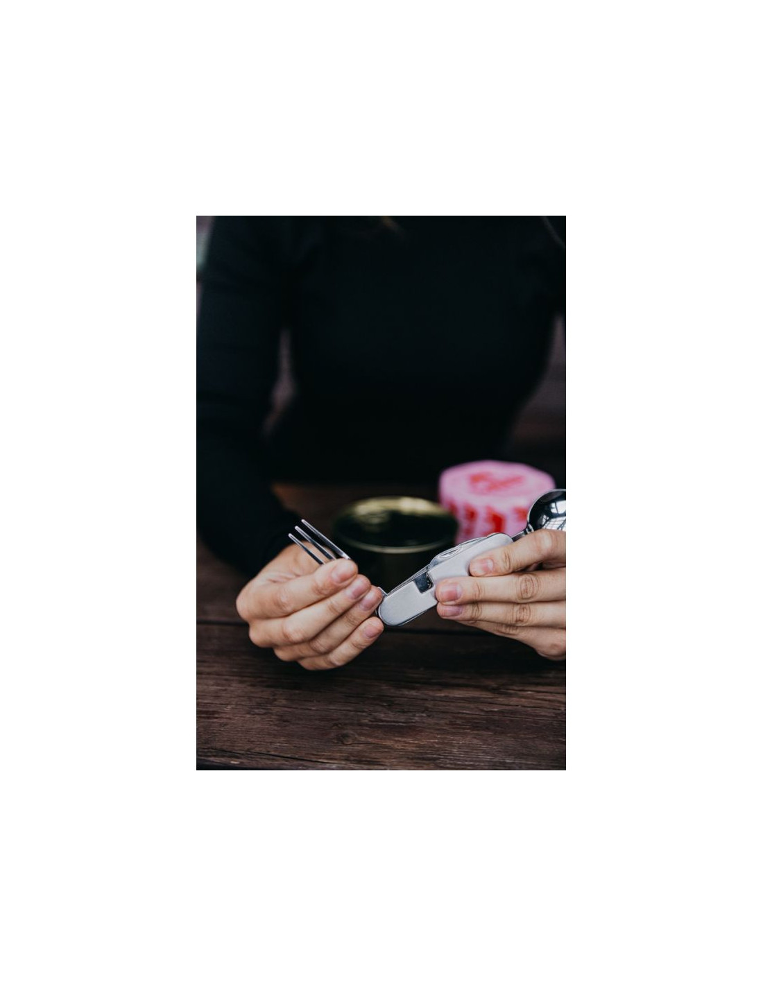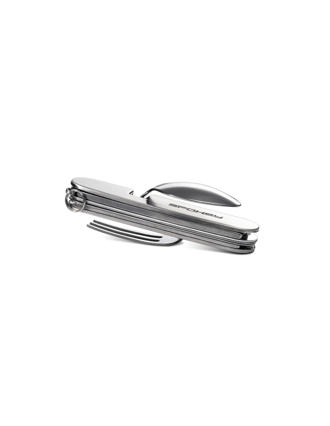 - Lekki i poręczny niezbędnik sztućców turystycznych typu 4w1, składający się z łyżki, widelca, noża i otwieracza.