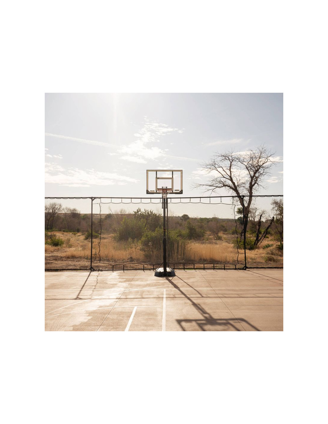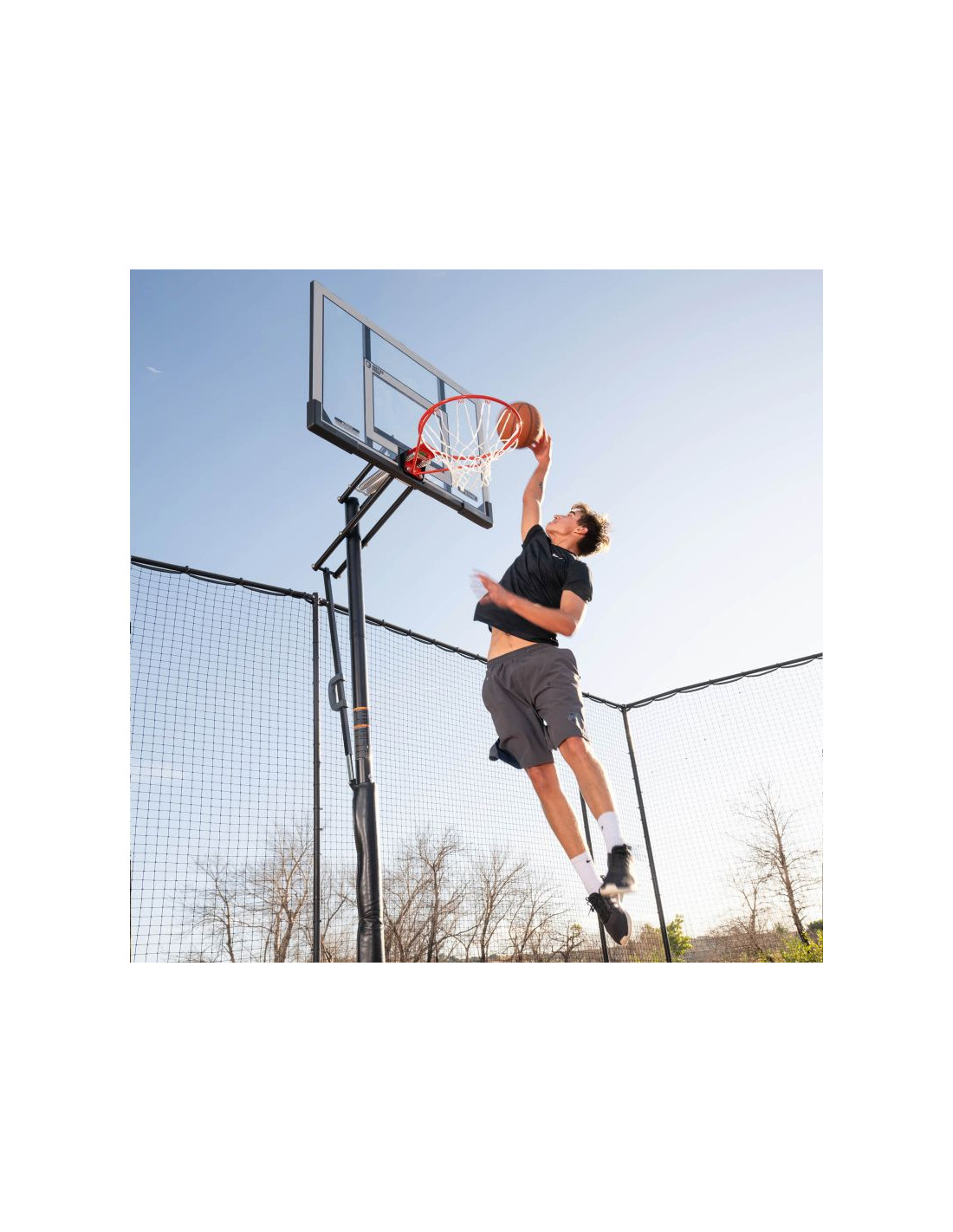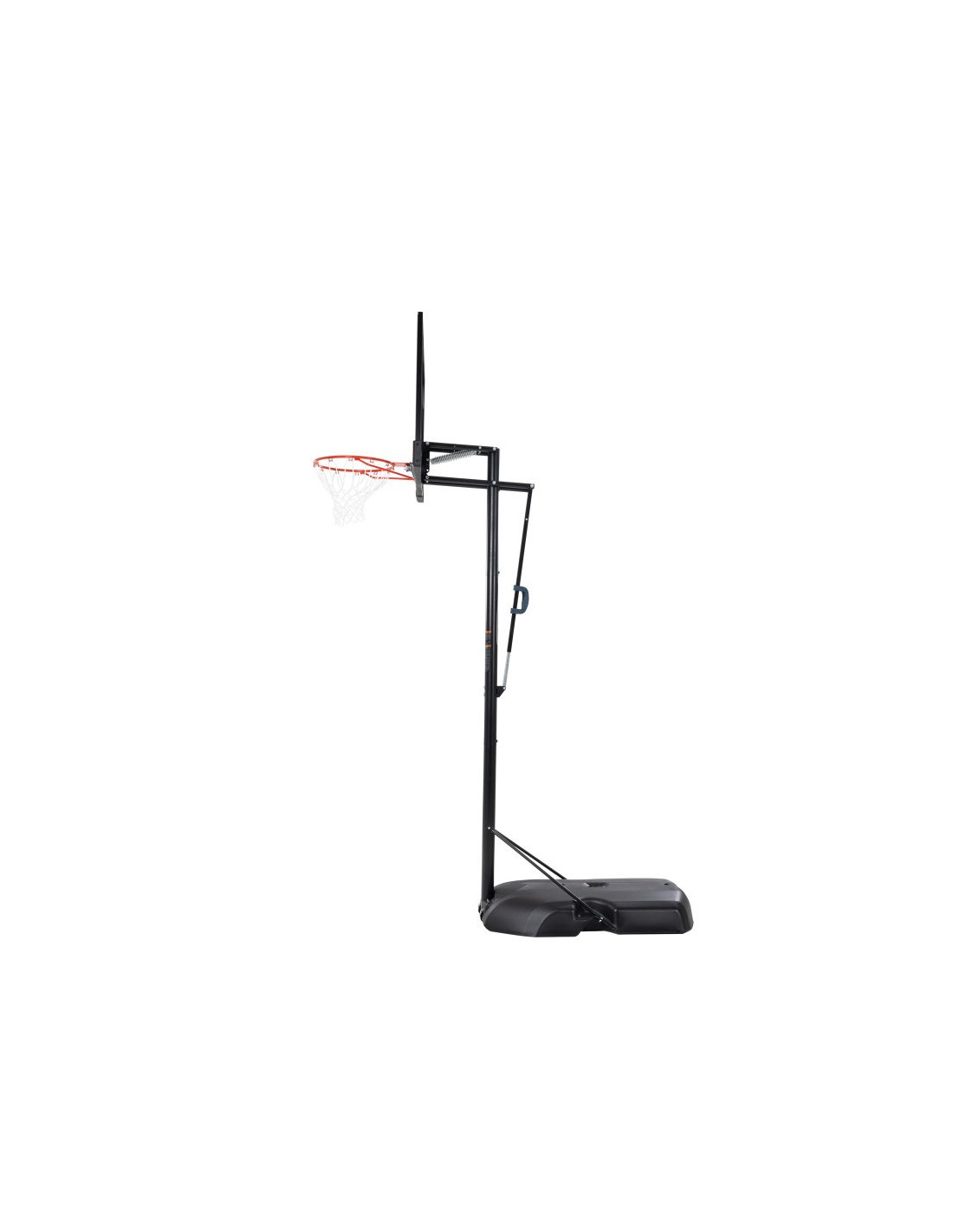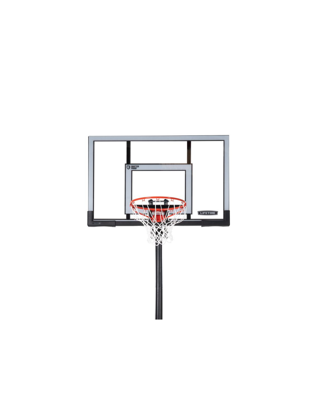 Przenośny stojak do koszykówki posiada 50" tablicę wykonaną w technologii Steel-Framed Shatter-Proof. Technologia Shatter-Proof gwarantuje wieloletnią trwałość i odporność na uderzenia dzięki powłoce z najwyższej jakości poliwęglanu Makrolon®. Steel-Framed to wytrzymała stalowa rama tablicy. Teleskopowa regulacja wysokości tablicy pozwala na szybkie i łatwe ustawienie jej na różnych wysokościach w zakresie od 240 do 300 cm zapewniając komfortową i bezpieczną grę na każdym poziomie zaawansowania. Całość uzupełnia wytrzymała obręcz posiadająca elastyczny, uchylny mechanizm Slam-It® oparty na systemie podwójnych sprężyn oraz odporna na warunki atmosferyczne nylonowa siatka i okrągły słup o średnicy 7,62 cm.  Podstawa HDPE o pojemności 45 litrów wypełniana wodą lub piaskiem zapewnia pełną stabilność stojaka. Idealny zestaw dla średniozaawansowanych i zaawansowanych koszykarzy.