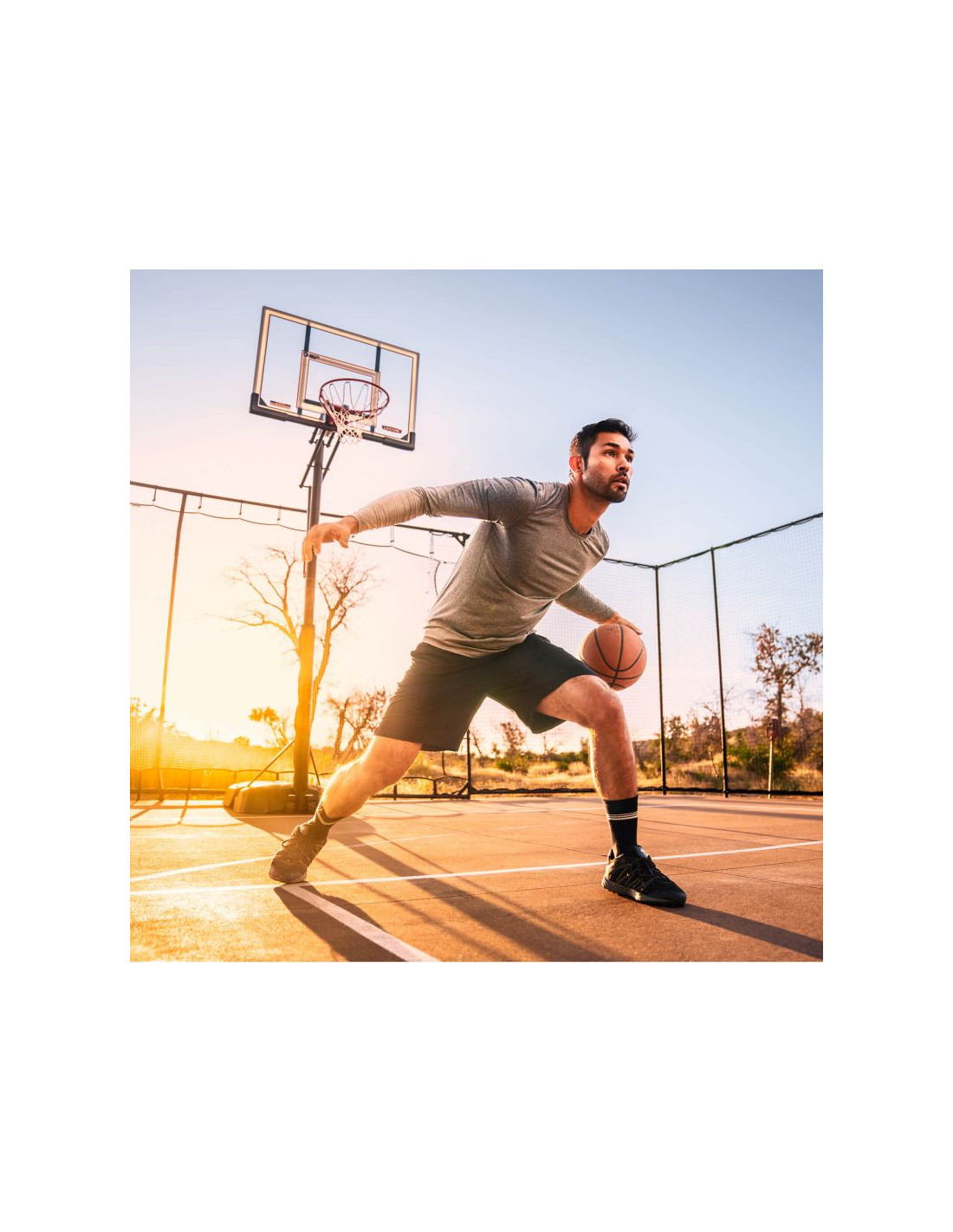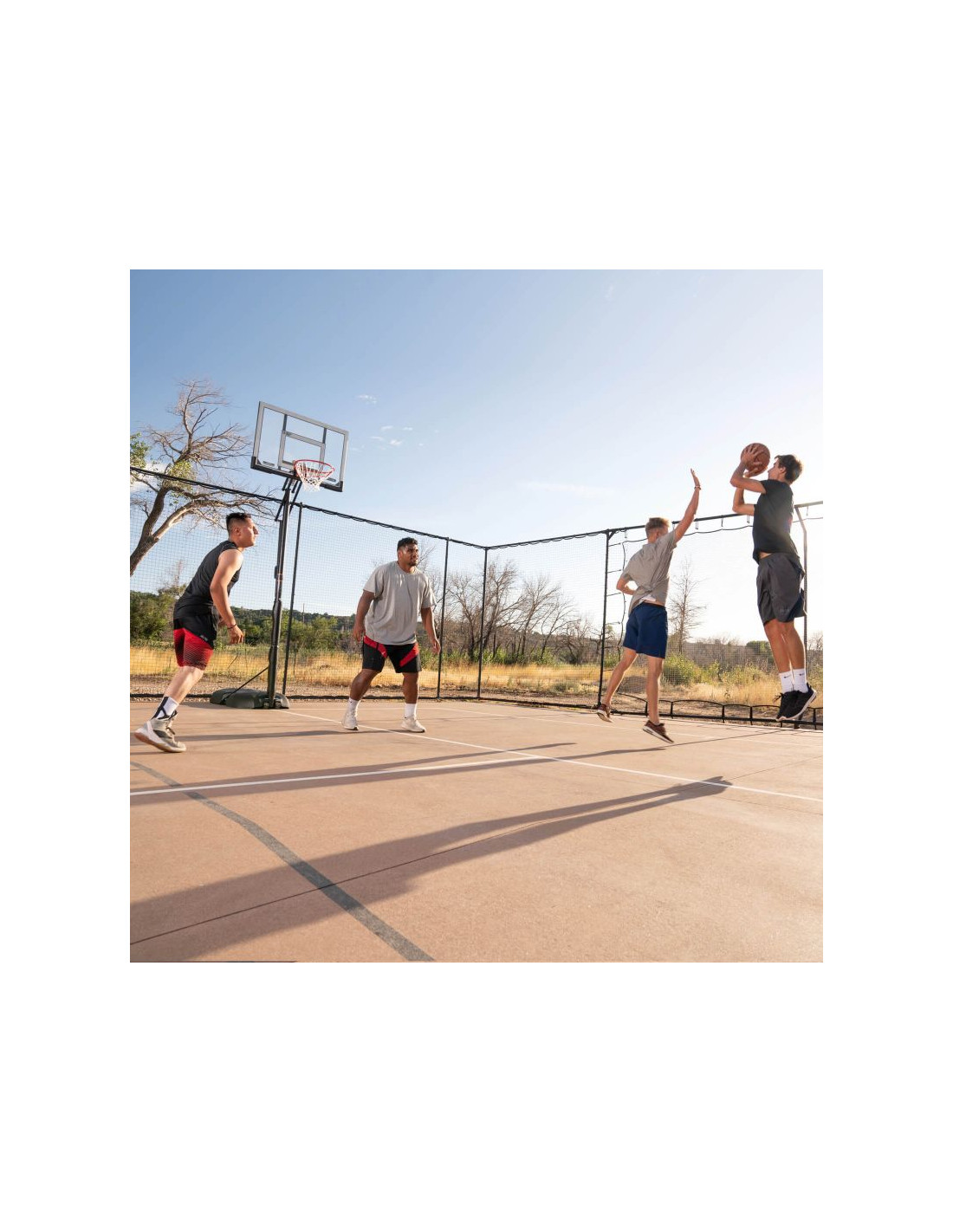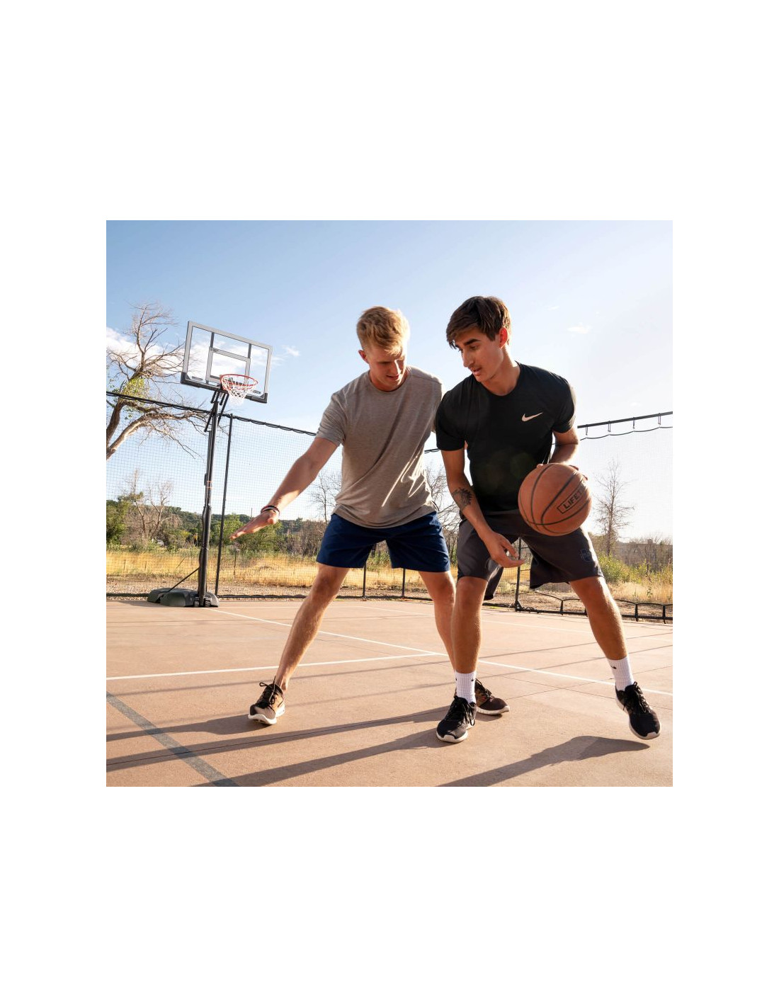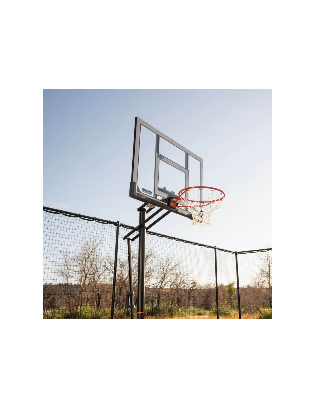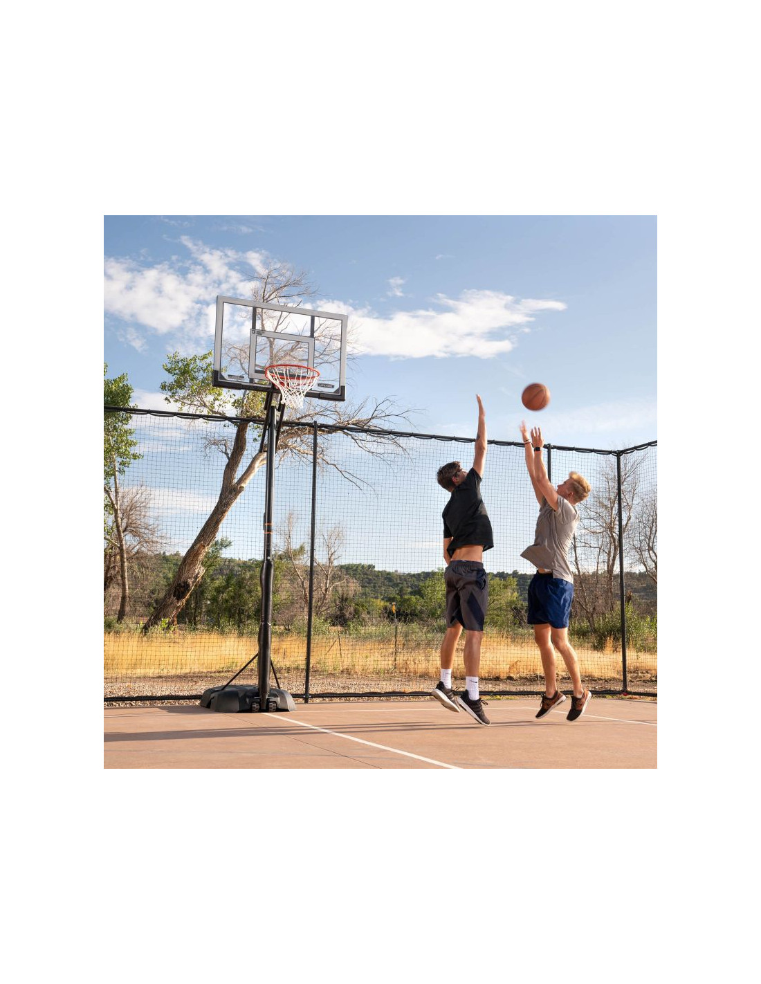 Przenośny stojak do koszykówki posiada 50" tablicę wykonaną w technologii Steel-Framed Shatter-Proof. Technologia Shatter-Proof gwarantuje wieloletnią trwałość i odporność na uderzenia dzięki powłoce z najwyższej jakości poliwęglanu Makrolon®. Steel-Framed to wytrzymała stalowa rama tablicy. Teleskopowa regulacja wysokości tablicy pozwala na szybkie i łatwe ustawienie jej na różnych wysokościach w zakresie od 240 do 300 cm zapewniając komfortową i bezpieczną grę na każdym poziomie zaawansowania. Całość uzupełnia wytrzymała obręcz posiadająca elastyczny, uchylny mechanizm Slam-It® oparty na systemie podwójnych sprężyn oraz odporna na warunki atmosferyczne nylonowa siatka i okrągły słup o średnicy 7,62 cm.  Podstawa HDPE o pojemności 45 litrów wypełniana wodą lub piaskiem zapewnia pełną stabilność stojaka. Idealny zestaw dla średniozaawansowanych i zaawansowanych koszykarzy.