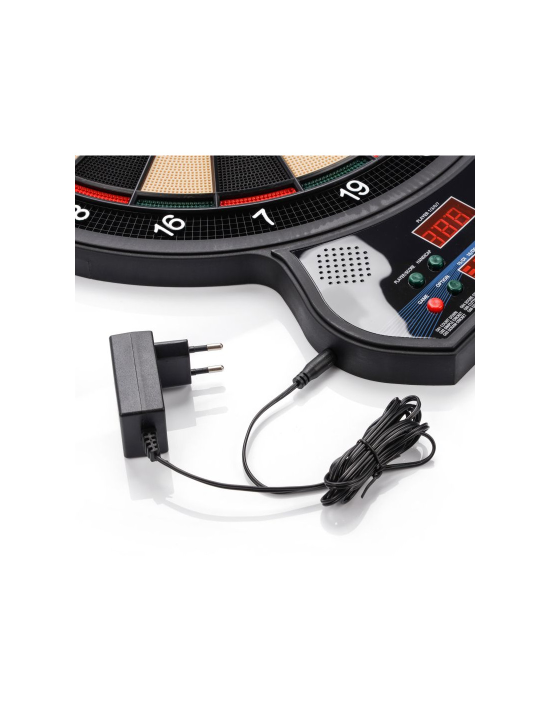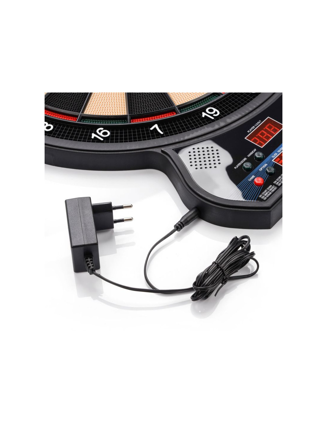 Tarcza do darta Meteor elektroniczna 4-Led 24689 Tarcza do darta Meteor urozmaici wolny czas. Rzutki z zapasowymi końcówkami. Dane techniczne:· zasilana zasilaczem· 27 gier / 202 warianty· 8 graczy· 12 rzutek w zestawie· 4 wyświetlacze LED· efekty dźwiękowe· średnica tarczy: 42 cm· waga tarczy: ~ 1,3 kg· waga zestawu: ~ 1,9 kg· wymiary opakowania: 43 x 51 x 4 cm
