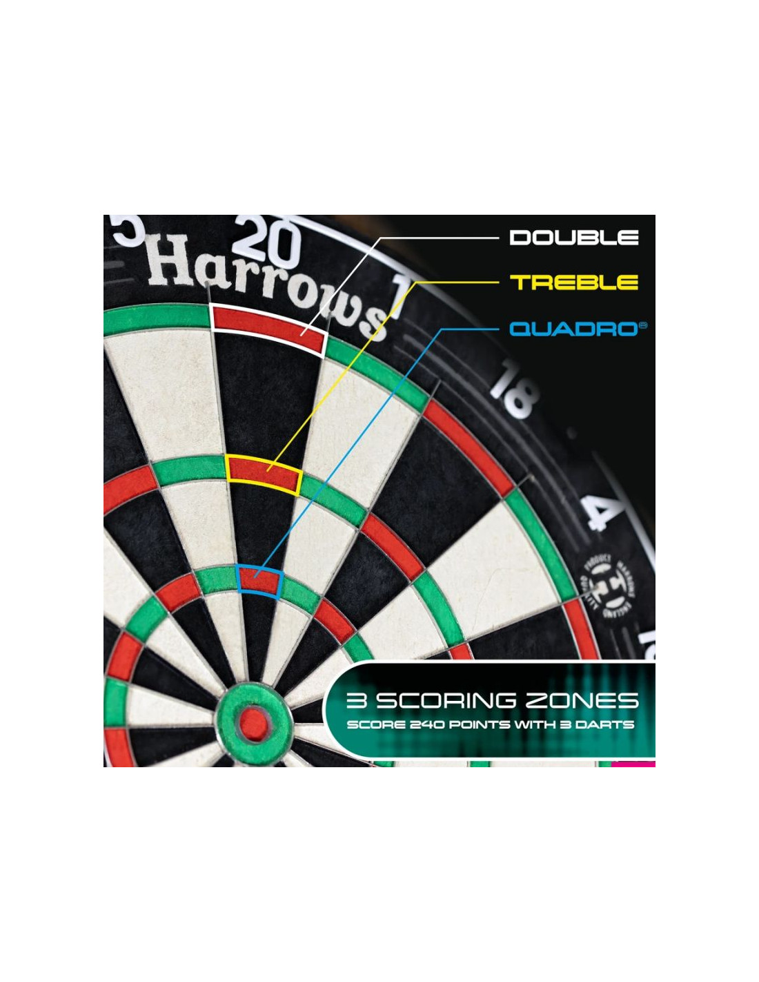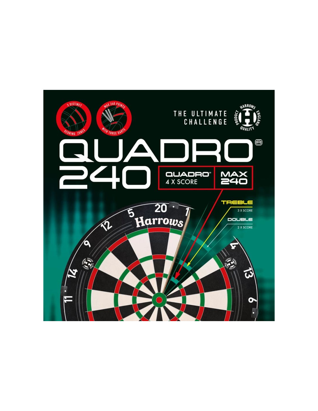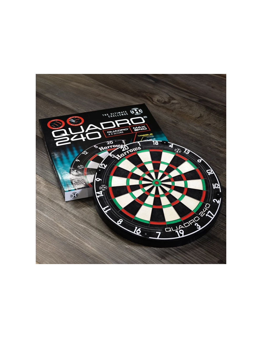 Tarcza Quadro 240 posiada dodatkowy, czwarty pierścień punktowy – tzw. Quadruple Ring, umieszczony pomiędzy potrójnym polem (triple) a bullseye. Pozwala on na zdobycie aż 80 punktów za jedno trafienie (Q20) i maksymalnie 240 punktów w jednej kolejce, co daje tej tarczy unikalny charakter i zupełnie nowe możliwości strategiczne w grze.