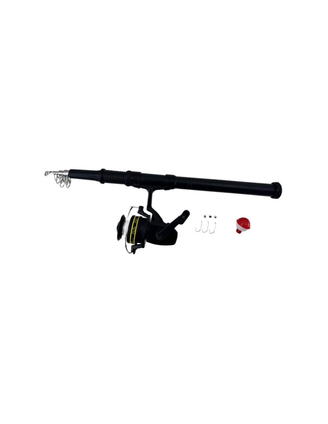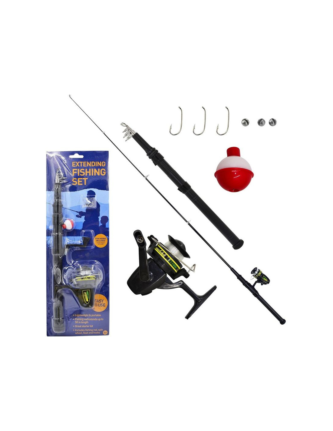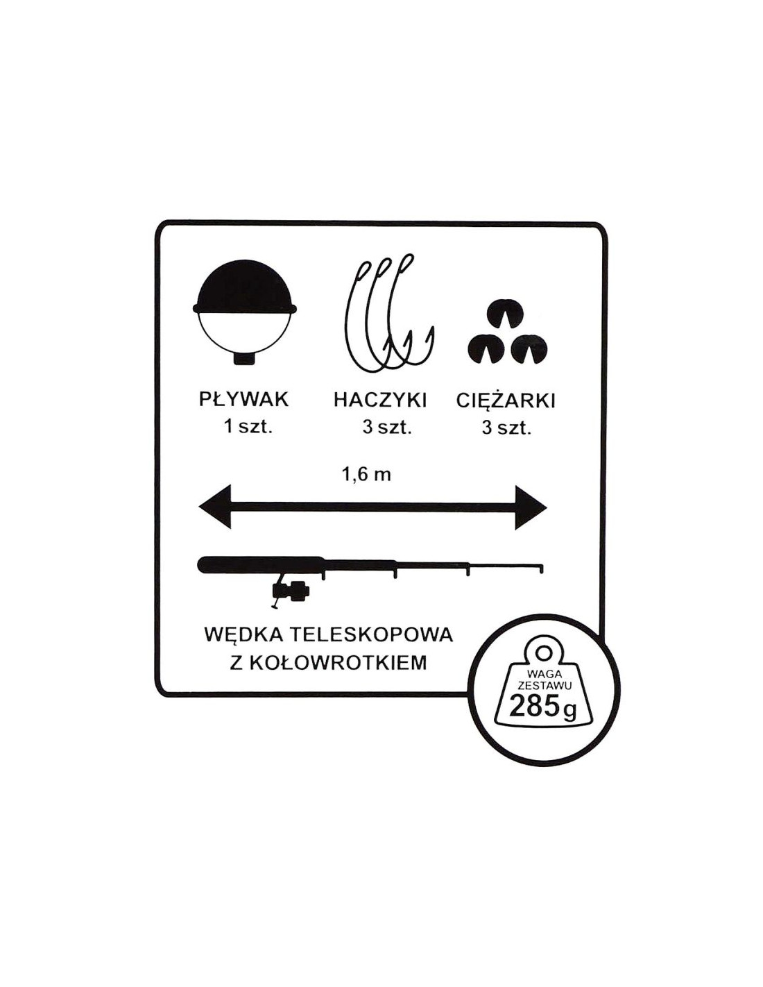 - W zestawie: wędka z wędziskiem plus kołowrotek, haczyk x 3 sztuki, spławik x1 sztuka, ciężarki x 3 sztuki