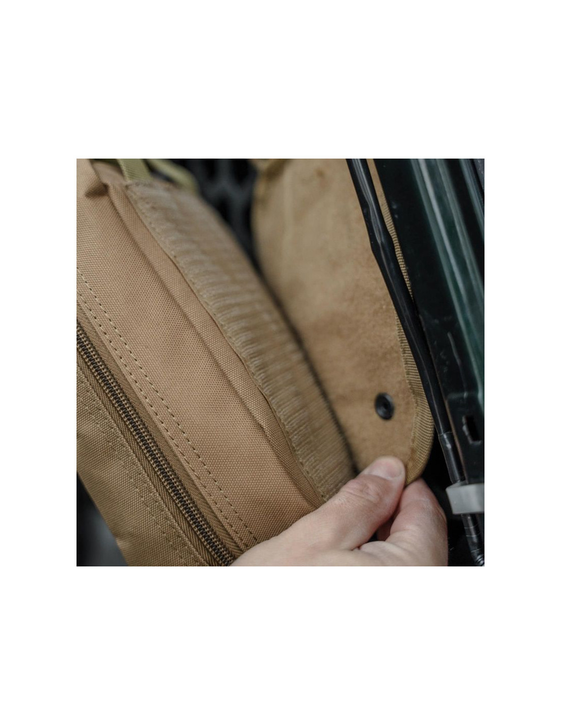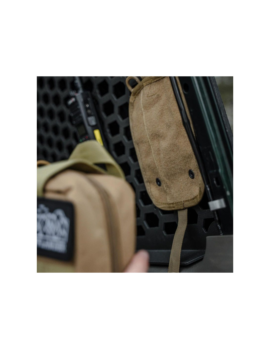- Doczepiana jest do panelu montażowego za pomocą mocnego rzepu oraz zabezpieczona trokiem z klamrą oraz klapą z zapięciem na rzep.