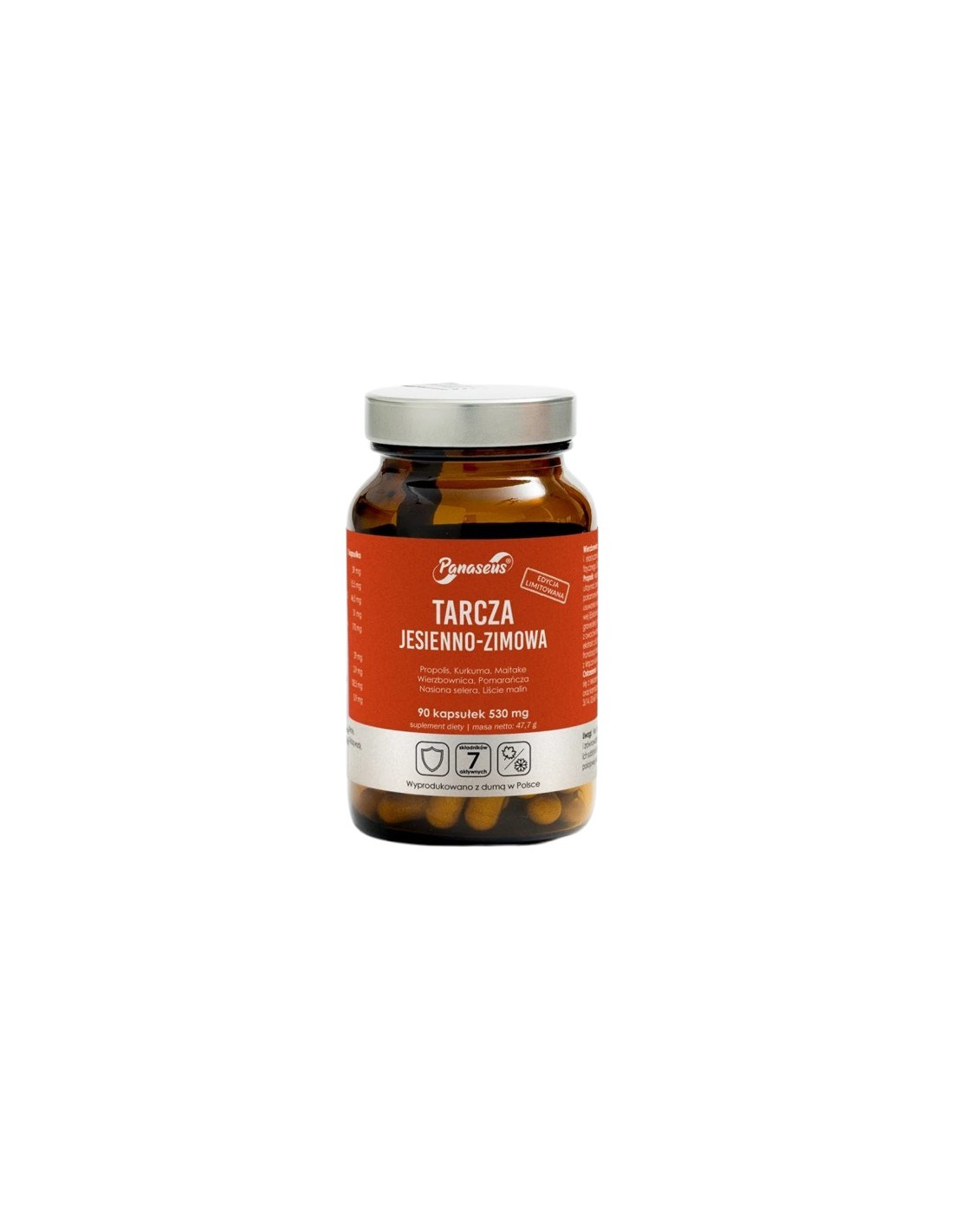 ekstrakt z ziela wierzbownicy drobnokwiatowej (Epilobium parviflorum) 10:1, ekstrakt z nasion selera naciowego (Apium graveolens) standaryzowany na zawartość min. 0,8% apigeniny, ekstrakt z owoców słodkiej pomarańczy (Citrus sinensis) 10:1, ekstrakt z propolisu 4:1, ekstrakt z liści malin (Rubus ideaus) 10:1, ekstrakt z grzyba maitake (Grifola frondosa) standaryzowany na zawartość min. 10% polisacharydów, ekstrakt z kłącza kurkumy (Curcuma longa) 10:1, skład kapsułki: celuloza roślinna.