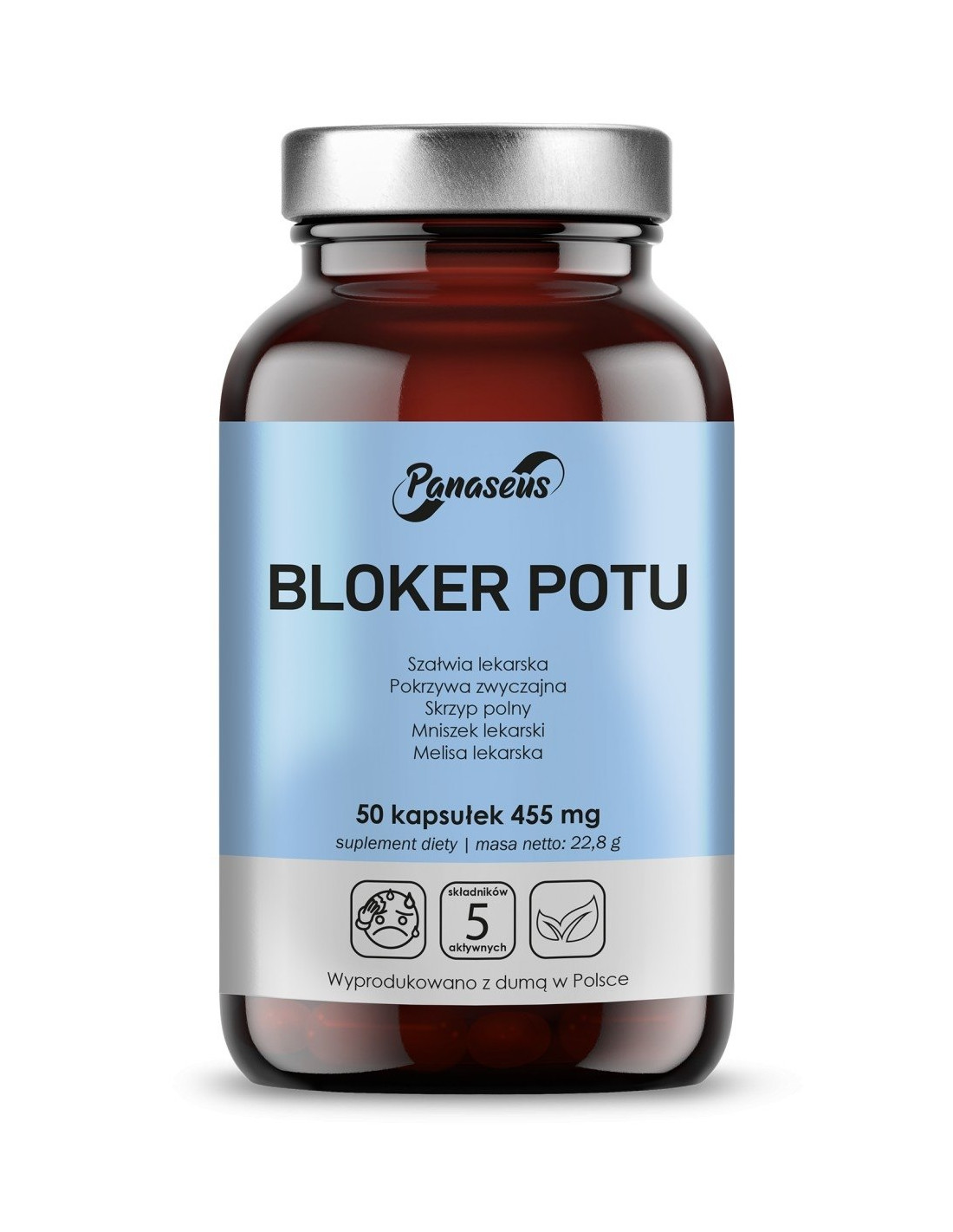 Ekstrakt z liści szałwii lekarskiej (Salvia officinalis) 20:1, ekstrakt z liści pokrzywy zwyczajnej (Urtica dioica) 20:1, ekstrakt z ziela skrzypu polnego (Equisetum arvense) standaryzowany na zawartość 7% krzemionki, ekstrakt z korzenia mniszka lekarskiego (Taraxacum officinale) 10:1, ekstrakt z liści melisy lekarskiej (Melissa officinalis) 10:1. Skład kapsułki: Celuloza roślinna (wegetariańskie).